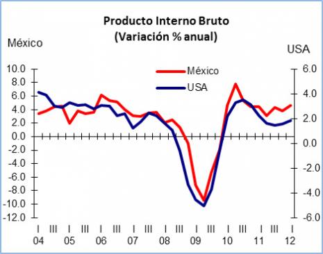 En el 1Q 2012, la economía mexicana creció 1.31% con relación al cuarto trimestre de 2011 (en cifras desestacionalizadas). En términos anuales (respecto al 1Q 2011), que es un comparativo más común, el crecimiento fue de 4.6%, una tasa que destaca en medio de un ambiente internacional dominado por la recesión en Europa. Además, la cifra es superior a las previsiones de los especialistas del sector privado (encuesta de Banxico), que en los meses recientes esperaban una tasa alrededor de 3.7% para este periodo. Con este resultado, seguramente deben mejorara las expectativas para este año.
