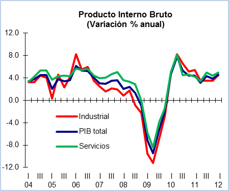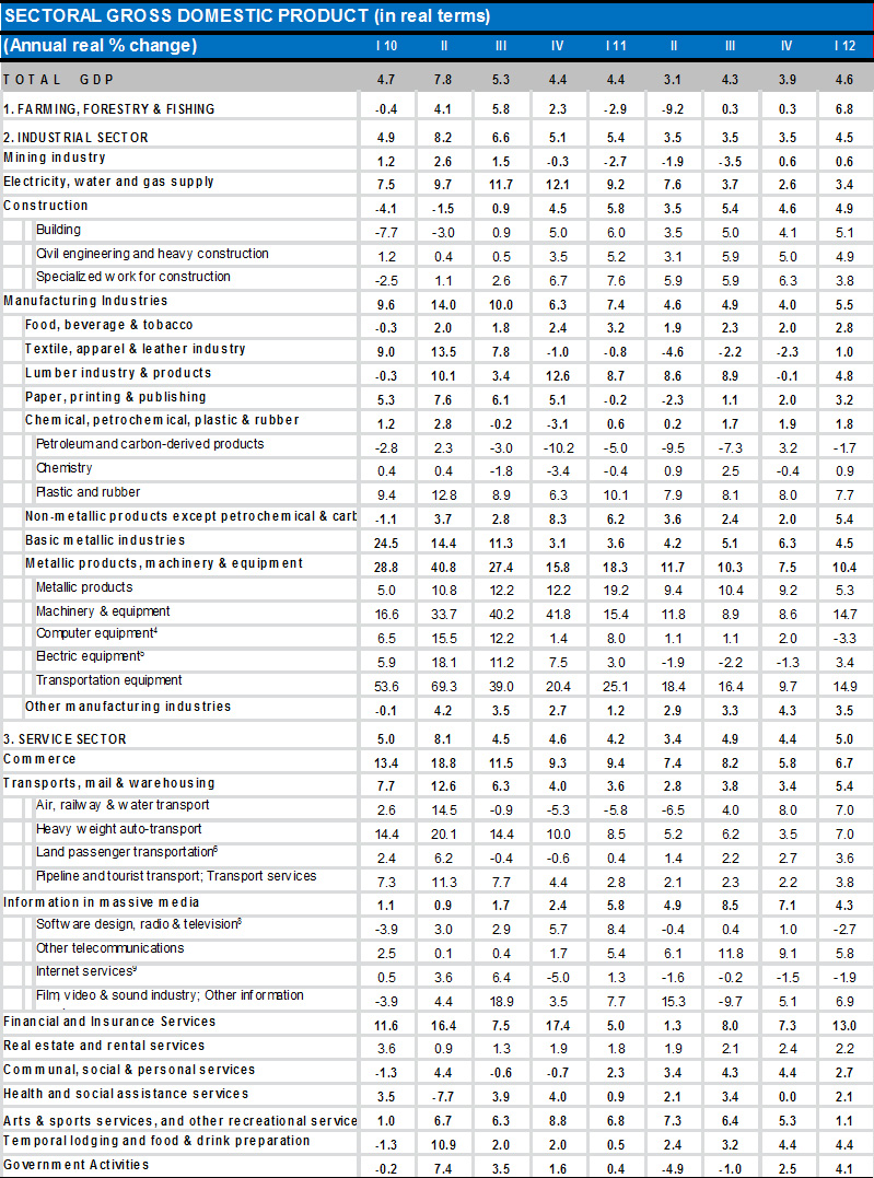 Por su parte, el sector industrial –constituye 35% del PIB total- creció 4.5% anual en el 1Q 2012, favorecido las manufacturas, que crecieron 5.5% (representa 50% del sector industrial) y la construcción con 4.9% de avance (constituye 19% del PIB industrial). Dentro de las manufacturas destaca en particular el crecimiento de la industria automotriz (14.9%), derivado del buen ritmo en la producción y exportación de vehículos y autopartes.