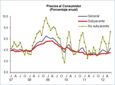 A pesar de lo errático de los precios subyacentes, quien marca la dirección de la inflación general es el componente subyacente, que pesa 76.7% del INPC, y ha mostrado en junio un incremento de 3.50% anual. Su trayectoria es estable y refleja en cierta forma la inflación estructural de la economía. Desde 2001, su nivel de volatilidad medido a través de su tasa mensual ha sido significativamente menor que la del no subyacente (casi una décima parte).
