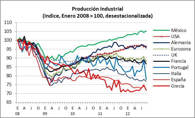 sos críticos son España, Grecia, Italia y Portugal (los PIGS, por sus siglas en inglés), cuya producción industrial se encuentra entre 25% y 30% por debajo de su valor previo a la crisis. La Eurozona (17 países) está aún 12% por debajo de 2007.