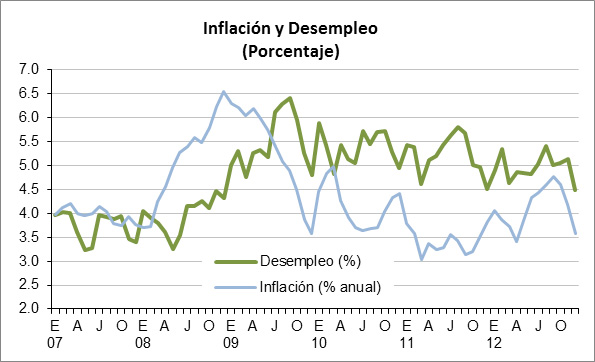 Sin embargo, a pesar del buen crecimiento del PIB, la tasa de desempleo descendió sólo marginalmente, de 5.2% en 2011 a 5.0% promedio anual en 2012. En cambio, visto por los asegurados en el IMSS (una vista alternativa del empleo), éste reportó en 2012 un avance de 4.6%, su mejor desempeño desde el año 2000.
