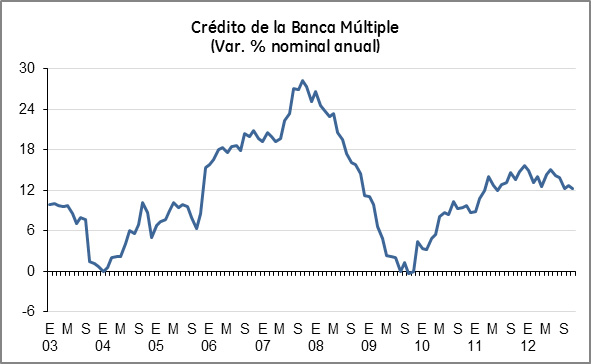 El crédito de la banca múltiple habría crecido 13.4% promedio anual en 2012, ligeramente superior al 12.9% de 2011. Sin embargo, el comportamiento sigue siendo diferenciado: 9.4% anual el hipotecario, 11.4% el comercial (empresas, gobierno y entidades financieras), y 22.7% anual el de consumo (tarjetas de crédito, personales y nómina). El crédito empresarial representa hoy 10.4% del PIB; si bien se observa una recuperación año con año, presenta aún un rezago significativo con relación al 27.0% del PIB reportado en 1994.