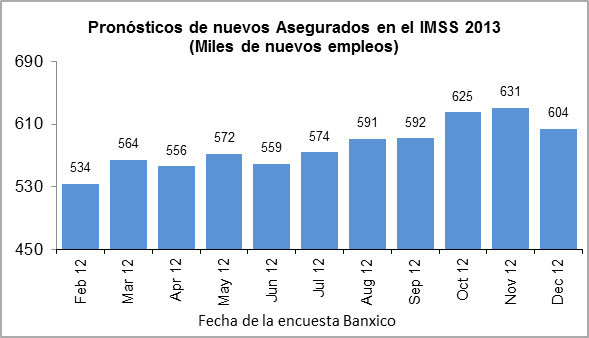 Aunque la encuesta no contempla las expectativas de la tasa de desempleo, los analistas pronostican el incremento en el número de asegurados en el IMSS, un proxy sobre la generación de empleos. Después que en 2012 se generaron casi 712 mil empleos formales (vía el IMSS), en este año se prevé que se generarían 604 mil nuevos empleos.
