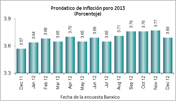 Después de la baja de la inflación del último trimestre de 2012 (reflejó el fin del impacto del alza en los precios del huevo de los meses previos), los analistas mejoran levemente sus previsiones inflacionarias para este año, a 3.69%, lo que la ubicaría dentro del rango establecido por Banxico para el mediano plazo: entre 2% y 4%. Con los datos de la primera quincena de enero (3.21% anual), la encuesta de enero seguramente debe reflejar una baja en la estimación de inflación para este año.