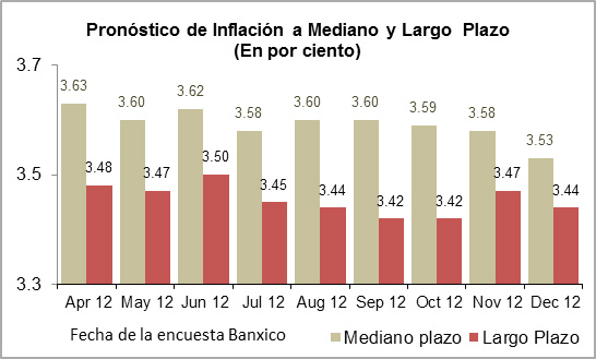 Para el mediano y largo plazos las expectativas de inflación son estables: y tendiendo hacia 3.5% para un horizonte de cuatro y ocho años. Ello demuestra el carácter estructural de la estabilidad de precios que ha experimentado México desde 1999, y que podría ser la tónica para los próximos años. Hoy, la estabilidad de precios es uno de los grandes activos de la economía mexicana y el mercado cree que la actual administración lo mantendrá como una de sus metas importantes.