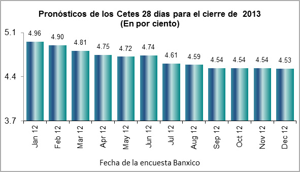 Mientras que los Cetes a 28 días promediaron 4.05% en Dic. 12, los analistas del sector privado piensan que éstos cerrarán este año en 4.53%, que de ser así, se ubicarían ligeramente arriba del 4.50% de la tasa de referencia o de política monetaria. Debe señalarse que, tradicionalmente, los cetes a 28 días se han ubicado por debajo del de referencia. Asimismo, se prevé que el tipo de cambio cierre este año en MXP/USD 12.69, lo que significa que el mercado está una leve apreciación del Peso (cerró 2012 en 12.97 pesos).
