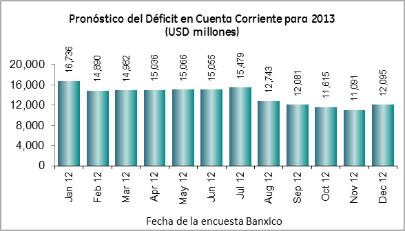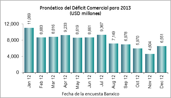 Las estimaciones de los analistas sobre la balanza comercial y la cuenta corriente han sufrido cambios importantes en el último año. En enero de 2012 se creía que el déficit comercial para este 2013 sería de USD 11,069 millones; hoy se estima que sería de sólo USD 6,551 millones, evidenciándose las dificultades que representa pronosticar la dinámica de las exportaciones e importaciones, mismas que responden a factores como el tipo de cambio, el PIB de México, el PIB de Estados Unidos, entre otras variables. El viernes 25 de enero, el INEGI dio a conocer que la balanza comercial de 2012 fue superavitaria en USD 163 millones, condición que no se veía desde los tres superávits consecutivos de 1995-1997. En la encuesta de enero (Banxico lo dará a conocer el 1° de febrero), seguro veremos una corrección a la baja del déficit estimado para este año.
