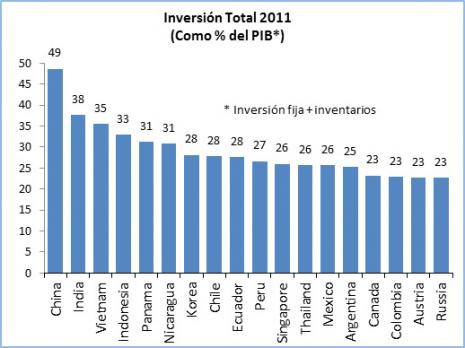 A nivel internacional, China e India, los países con mayor crecimiento económico en las últimas décadas, reportan hoy los mayores coeficientes de inversión: 49% y 38% del PIB, respectivamente. En este lado del continente, Perú, que en 1990 reportaba una inversión equivalente a 16% del PIB, hoy reporta 27%, lo que le ha permitido que esa economía crezca 5.0% anual entre 1990 y 2010 (6.4% en los recientes diez años).
