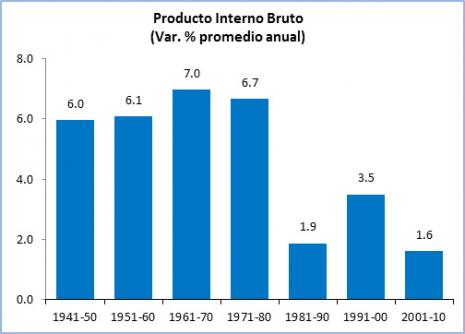 Es harto conocido que la economía mexicana ha transitado en las últimas décadas por dos periodos claramente diferenciados. El primero, de 1941 a 1980, donde el PIB creció 6.4% promedio anual; el segundo, de 1981 a 2010, con un crecimiento modesto -pobre diría la CEPAL- de sólo 2.3% anual. En ambos periodos, el PIB per cápita creció 3.2% y 0.7% anual (virtual estancamiento), respectivamente. El primer periodo es conocido como el del “milagro mexicano”, que comprende sub periodos como el del “desarrollo estabilizador”, el modelo de “sustitución de importaciones” y el del “desarrollo compartido”. El segundo se corresponde con las políticas de ajuste y el del reciente “estancamiento estabilizador”.