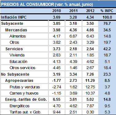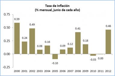 A pesar del repunte de la inflación de junio (0.46%), la inflación no es hoy en día la mayor preocupación de la economía, ya que desde 2001 México ha reportado un promedio inflacionario de 4.5% anual, con un máximo de 6.53% en 2008 y un mínimo de 3.33% en 2005 (cifras al cierre de año). En consecuencia, la inflación está bajo control, donde han sido fundamentales la política monetaria de Banxico, así como la perseverancia de la política económica para mantener cierto equilibrio en las finanzas públicas y un orden general de la economía.