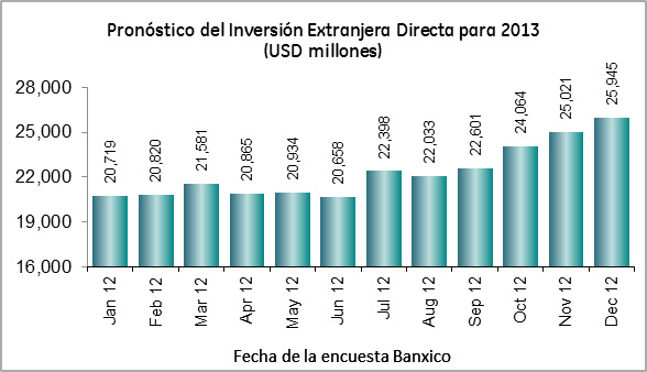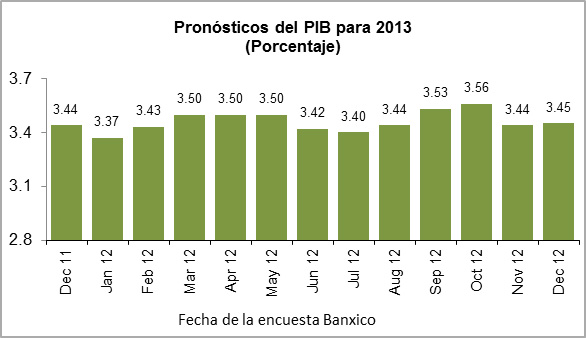 Cada mes, el Banco de México realiza una encuesta a los analistas del sector privado en torno a sus previsiones económicas. Mientras Europa, Estados Unidos y América Latina revisan a la baja sus expectativas de crecimiento económico para 2013, en México las expectativas del PIB se han mantenido estables mes con mes.