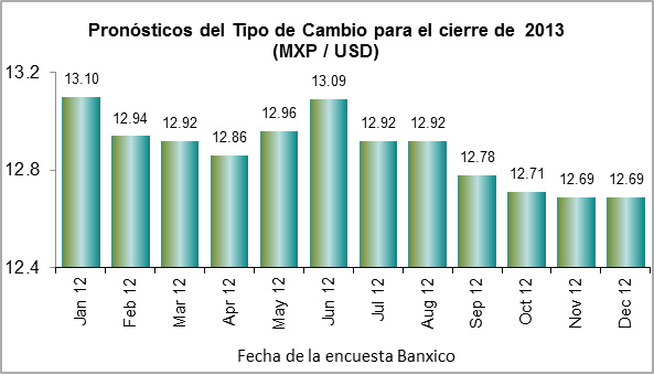 Mientras que los Cetes a 28 días promediaron 4.05% en Dic. 12, los analistas del sector privado piensan que éstos cerrarán este año en 4.53%, que de ser así, se ubicarían ligeramente arriba del 4.50% de la tasa de referencia o de política monetaria. Debe señalarse que, tradicionalmente, los cetes a 28 días se han ubicado por debajo del de referencia. Asimismo, se prevé que el tipo de cambio cierre este año en MXP/USD 12.69, lo que significa que el mercado está una leve apreciación del Peso (cerró 2012 en 12.97 pesos).