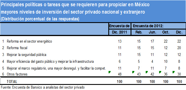 Más de 50% de los encuestados por Banxico señalan tres políticas como las importantes para propiciar la inversión nacional y extranjera: reforma energética, reforma fiscal y una mejoría en la seguridad pública, en ese orden. La lectura es que, en la medida que estas tres reformas se materialicen en esta nueva administración, la inversión ganará peso en la economía y se podrá garantizar un crecimiento suficiente para absorber las necesidades del mercado laboral (1.2 millones de empleos al año).