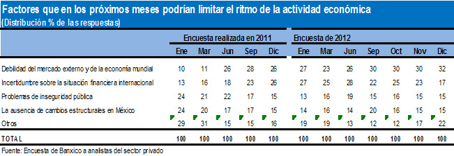 Asimismo, los analistas identifican a la debilidad de la demanda externa y la incertidumbre sobre la situación financiera internacional como los principales factores que limitarían el crecimiento de México para los próximos meses. La primera se atribuye a que Estados Unidos crecería alrededor de 2.0% en 2013 y Europa se mantendría estancada. La coyuntura no favorece mucho a México, ya que Estados Unidos tiene pendiente resolver el fiscal Cliff citado (en su versión final), además de que la transición sexenal puede retrasar las decisiones de inversión, mientras el nuevo gobierno define las principales líneas de su programa económico y define su Plan Nacional de Desarrollo. Este último define los proyectos de largo plazo. Es por ello que, en este año México crecería solamente 3.2%.