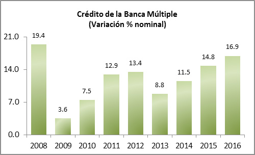 El crédito de la banca múltiple habría crecido 13.4% promedio anual en 2012, ligeramente superior al 12.9% de 2011. Sin embargo, el comportamiento sigue siendo diferenciado: 9.4% anual el hipotecario, 11.4% el comercial (empresas, gobierno y entidades financieras), y 22.7% anual el de consumo (tarjetas de crédito, personales y nómina). El crédito empresarial representa hoy 10.4% del PIB; si bien se observa una recuperación año con año, presenta aún un rezago significativo con relación al 27.0% del PIB reportado en 1994.