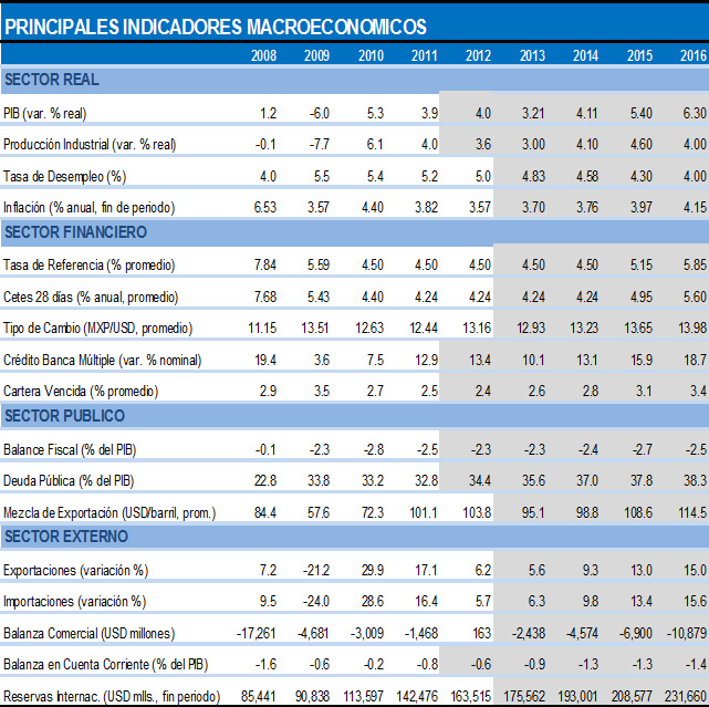 Las condiciones actuales de la economía mexicana son favorables; ello, en razón de que sus principales fundamentos están en orden y su desempeño reciente ha sido aún positivo: PIB, inflación, finanzas públicas, balanza de pagos, entre otros. Todo ello en un ambiente externo aún desfavorable, principalmente en Europa y en menor medida América Latina, mientras que Estados Unidos se ha desacelerado en 2011-2012 y queda pendiente definir el tema del techo de la deuda pública.