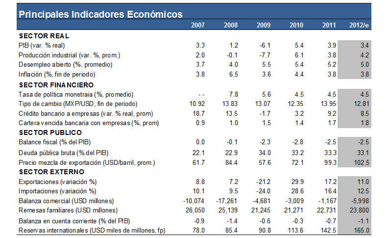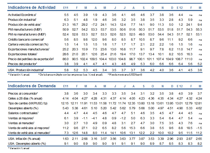 Al 13 de abril, las reservas internacionales ascendieron a USD 151,480 millones, reportando un nuevo máximo histórico. En 2010 y 2011, éstas aumentaron USD 22,759 y USD 28,879 md, en cada caso, mientras que en lo que va de 2012 el aumento es por USD 9,004 md. En un régimen de flotación cambiaria, donde en teoría no debieran acumularse reservas, Banxico las ha hecho, permitiendo la estabilidad del tipo de cambio y operando como un soporte para garantizar la liquidez del país ante un posible "ataque" contra el peso. Las reservas equivalen hoy a 5.1 meses de importaciones, su mayor nivel desde 1987.