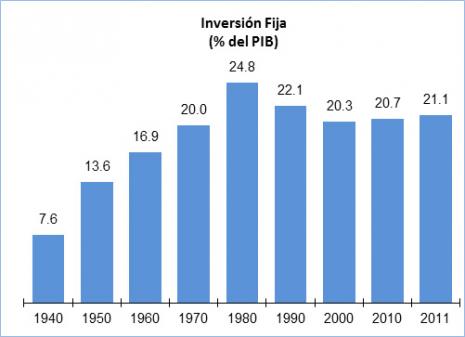 Veamos. Entre 1940 y 1980, la inversión fija del país creció 9.0% promedio anual (en términos reales), derivándose de ello un 6.4% anual para el PIB, como ya se dijo antes. Con ello, el coeficiente de inversión pasó de 7.6% del PIB en 1940 a 24.8% en 1980. Desde entonces (1981-2010), la inversión creció por debajo del 2.3% de la economía, razón por la cual hoy representa sólo 21% del PIB. En términos relativos, que es como muchas veces debe analizarse la economía, la inversión se ha contraído.